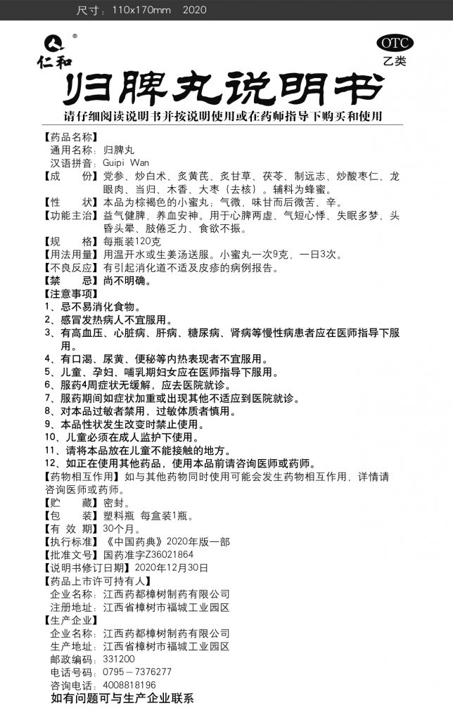 益氣健脾,養(yǎng)血安神。用于心牌兩虛、氣短心悸、失眠多夢、頭昏頭暈、肢倦乏力、食欲不振。